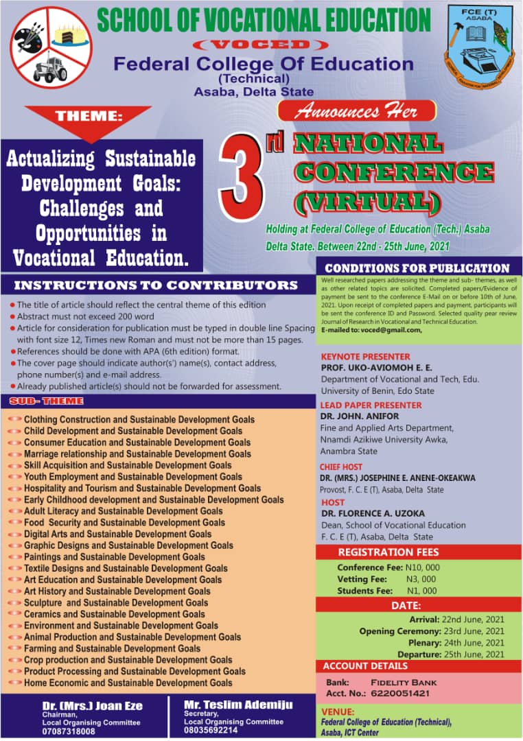 The conference is centered around the theme: "Actualizing Sustainable Development Goals: Challenges and Opportunities in Vocational Education." It will take place from 22nd to 25th June, 2021. The conference aims to bring together educators, researchers, and practitioners to discuss various sub-themes related to vocational education and sustainable development goals.